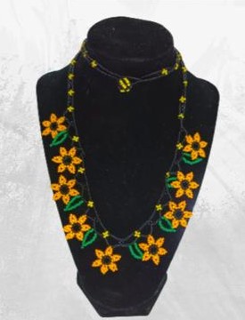Un collar artesanal en forma de girasol, símbolo de luz, energía y conexión con la naturaleza.