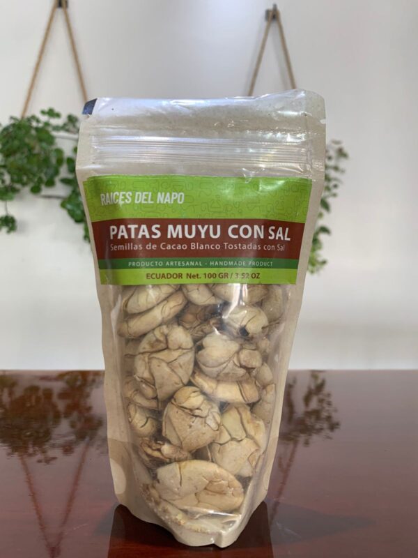 El producto mostrado en la imagen es un paquete de «Patas Muyu con Sal» de la marca Raíces del Napo, un snack artesanal ecuatoriano elaborado a partir de semillas de cacao blanco tostadas con sal. Estas semillas, también conocidas como «patas muyu», son una preparación tradicional en algunas regiones del Ecuador, donde se consumen como un aperitivo crujiente y con un ligero toque salado.