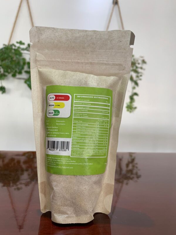 El empaque es una bolsa tipo stand-up pouch con una combinación de materiales: la parte superior es opaca y de color beige, mientras que la parte inferior es transparente, lo que permite ver el contenido del producto. Cuenta con un cierre hermético tipo ziploc, lo que ayuda a mantener la frescura y el sabor de las semillas por más tiempo.